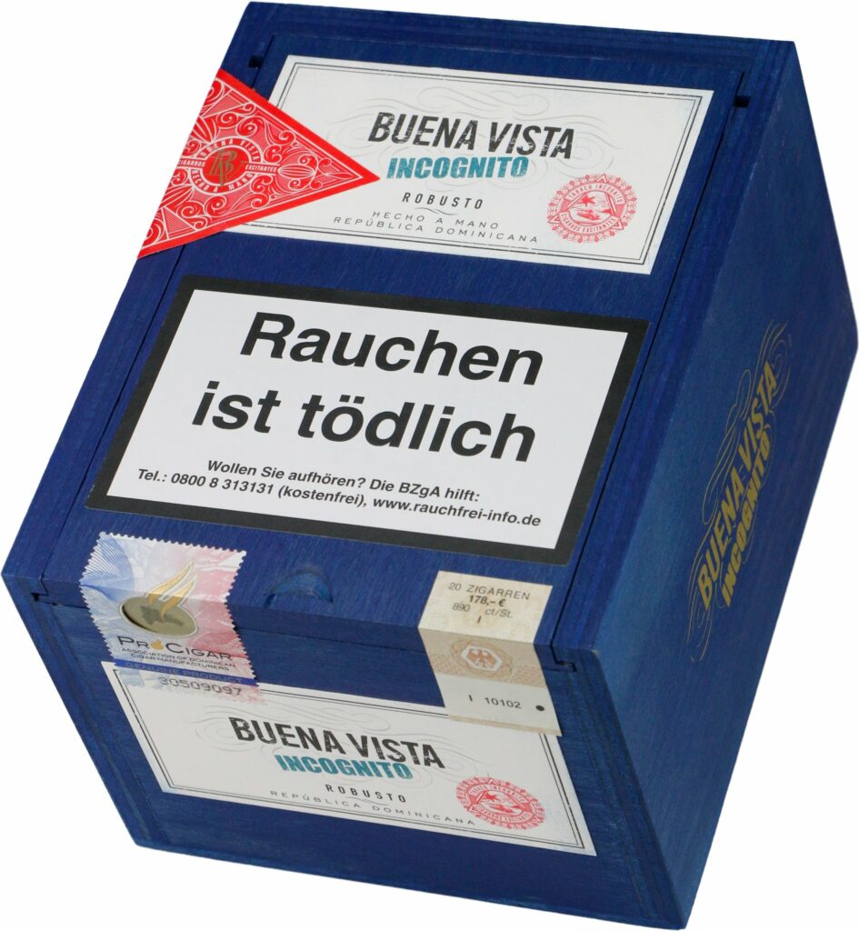 Die Zigarrenmarke BUENA VISTA steht für handgerollte Zigarren mit außergewöhnlichen Tabaken und besonderen Mischungen. Zigarren, die ein aufregend anderes Genusserlebnis bieten und ihresgleichen suchen. Besonders. Anders. Aufregend. Cigarros Excitantes. Natürlich gilt dies auch für diese Kreation von BUENA VISTA. Besonders, wenn sie den Namen "Incognito" trägt. Eine Zigarre, deren besondere Eigenschaft ein Geheimnis birgt, das man in einer Zigarre sicherlich nicht vermuten würde. Und es ist wahrscheinlich die spannendste Zigarre. Wir sind sicher, dass Liebhaber erdiger, würziger Zigarren ihr Geheimnis und das damit verbundene Genusserlebnis besonders schätzen werden. BUENA VISTA INCOGNITO, Cigarros Excitantes.