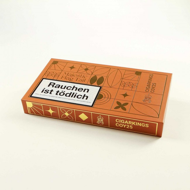 Die CigarKings COY 25 Majestic Flag Tail ist eine Hommage an die Pantone „Color of the Year 2025: Mocha Mousse“. Diese exklusive Premium-Zigarre verbindet meisterhafte Handwerkskunst mit einem außergewöhnlichen Aromenspiel aus Mokka-, Kaffee- und feinen Gewürznoten. Die COY 25 Majestic Flag Tail wird im traditionellen Entubado-Stil handgerollt, mit Flag-Tail-Kopf und geschlossenem Fuß. So entfaltet sich zunächst das pure Aroma des Deckblatts – ein seltener Luxus für Aficionados. Die CigarKings COY 25 ist mehr als eine Zigarre – sie ist ein Statement. Ein Symbol für Eleganz, Leidenschaft und die Verschmelzung von Tradition und Innovation. Perfekt für Kenner, die das Besondere suchen.