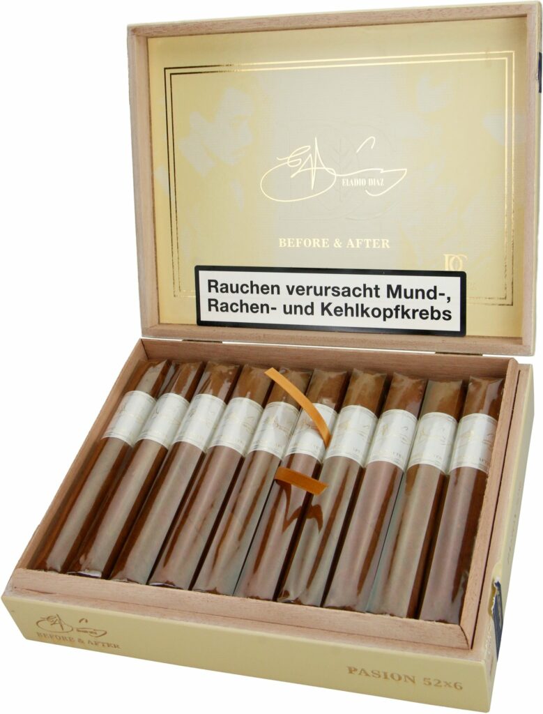 Die Pasion von Eladio Diaz Before & After ist eine Toro-Zigarre mit einer Länge von 14,6 cm und einem Ringmaß von 54. Diese mittelkräftige Zigarre bietet ein reiches Raucherlebnis mit cremigen, süßen und holzigen Noten, ergänzt durch eine feine Würze. Das Corojo-Deckblatt stammt aus Ecuador, während das Umblatt und die Einlage aus der Dominikanischen Republik kommen.