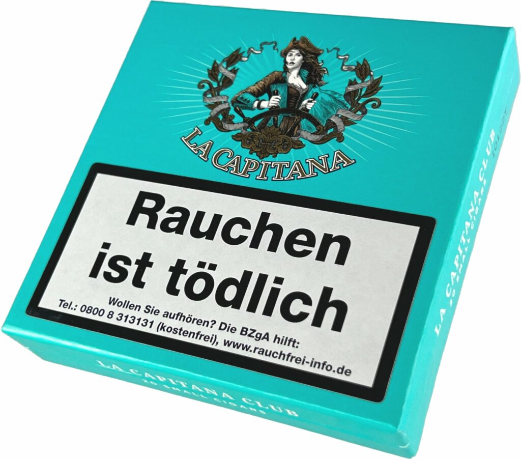 La Capitana symbolisiert die mutige Kapitänin, die ihr Schiff entschlossen durch die Herausforderungen der Weltmeere lenkt. Die beiden Cigarillo-Varianten, Mini und Club, präsentieren sich in stilvollen und handlichen 20er Kappenschachteln in auffälligem Türkis. Hergestellt aus 100% der besten karibischen Tabake, eignen sich diese Cigarillos perfekt für einen kurzen Genussmoment, begleitet von einem Espresso oder Brandy. Ihr Geschmack ist aromatisch und vollmundig, geprägt von feinen Holz- und Röstnoten.