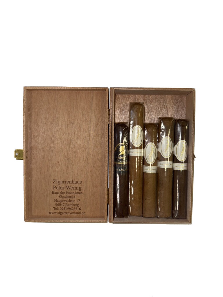 Unser Davidoff-Sampler ist eine exquisite Auswahl handgefertigter Zigarren, die das Beste repräsentieren, was die Marke Davidoff zu bieten hat. Bekannt für ihre herausragende Qualität, handwerkliche Perfektion und anspruchsvollen Geschmack, bieten Davidoff Zigarren ein einzigartiges Raucherlebnis. Ein Sampler von Davidoff ist ideal für Kenner, die die Vielfalt und Raffinesse dieser weltbekannten Marke erkunden möchten. Der Sampler beinhaltet: 1 x Winston Churchill The Late Hour-Robusto- 1 x Aniversario N°3 - 1 x Signature 6000 - 1 x Grand Cru Robusto - 1 x Millennium Robusto (inkl. Holzkiste)