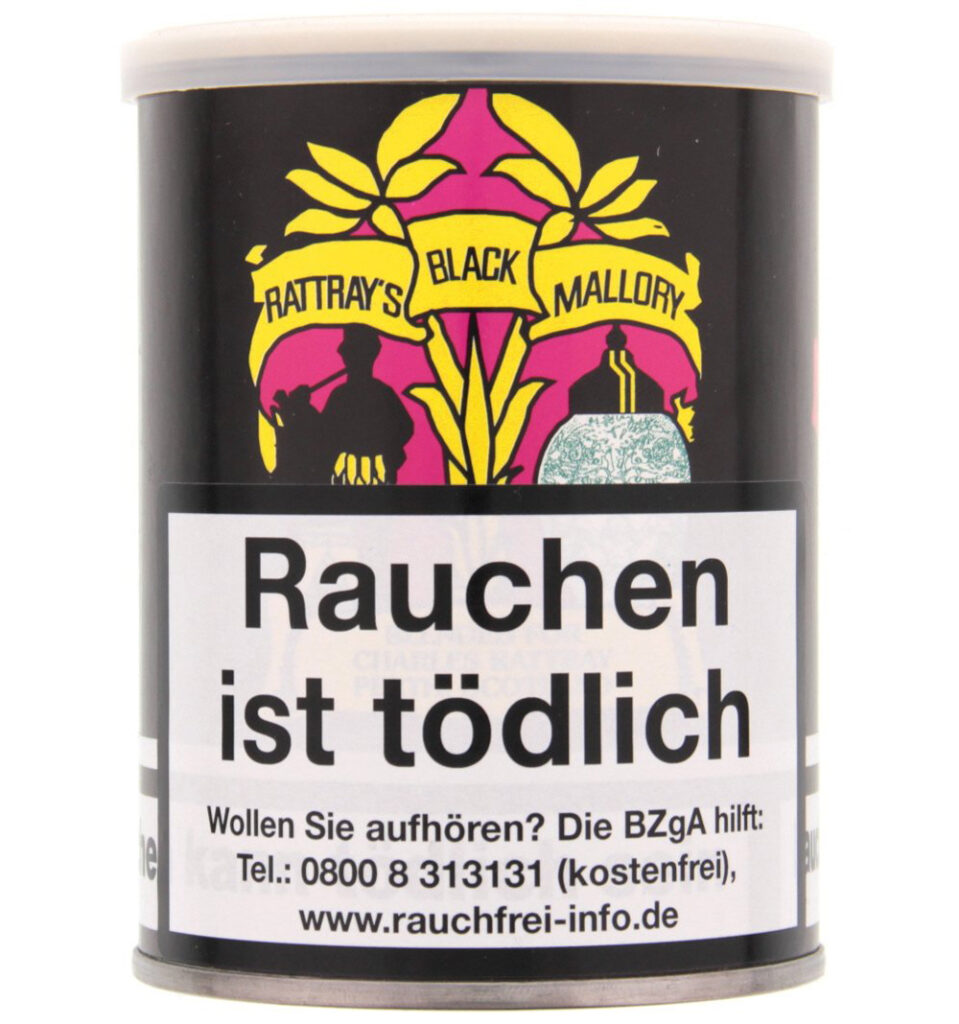 Der Rattray's British Collection Black Mallory Pfeifentabak - ist eine beeindruckende Mischung, die sofort beim Öffnen der Dose begeistert. Die Farbkomposition aus schwarzen und hellbraunen Tabaken sieht nicht nur ansprechend aus, sondern verströmt auch einen kräftigen, herben Duft. Verantwortlich dafür sind der würzige Latakia sowie zwei verschiedene Virginias, die mit Orient und Black Cavendish kombiniert sind. Vielleicht erinnert der Duft auch an bekannte Blends wie 7 Reserve oder Red Rapparee, da sie ähnliche Bestandteile enthalten. Die meisterliche Komposition sorgt für eine kräftige, tabakechte Mischung mit einem intensiven Aroma. Wenn Sie naturbelassene, klassische englische Tabake schätzen, werden Sie am Black Mallory sicherlich Freude haben!