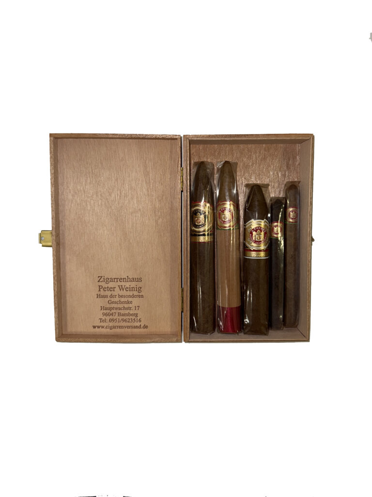 Entdecken Sie die Welt der Arturo Fuente Zigarren mit unserem exklusiven Sampler. Arturo Fuente Zigarren sind bekannt für ihre außergewöhnliche Qualität und die Vielfalt der Aromen, die sie bieten. Seit Generationen stellt die Fuente Familie in der Dominikanischen Republik diese Meisterwerke her, die von Zigarrenliebhabern auf der ganzen Welt geschätzt werden. Unser Arturo Fuente Zigarren Sampler enthält eine sorgfältig ausgewählte Auswahl der besten Zigarren aus dem Hause Fuente. Jede Zigarre verkörpert die Tradition, Handwerkskunst und Hingabe, die in jede Phase der Herstellung einfließen. Dieser Sampler bietet Ihnen die Möglichkeit, die ganze Bandbreite und die exquisiten Nuancen der Arturo Fuente Zigarren zu erleben. Der Sampler beinhaltet: 1 x Gran Reserva Rainforest Delight Slim Panatela - 1 x Don Carlos N°2 - 1 x Chateau Fuente Pyramids - 1 x Rosado Sungrown R58 - 1 x Classic Exquisitos Maduro (inkl. Holzkiste)